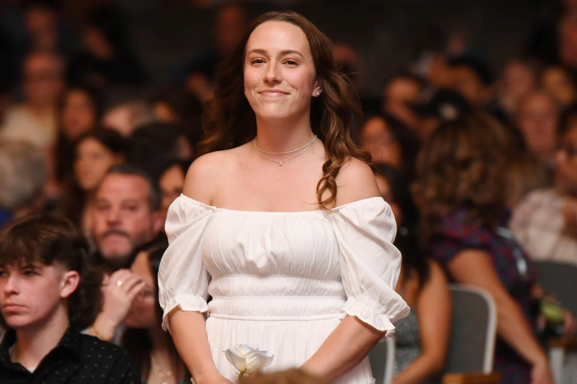 Graduate Andria Camporese of Hopewell Junction, N.Y., president of the Student Nurses Association, discussed the Class of 2023’s trials and triumphs at the nurse pinning ceremony.
