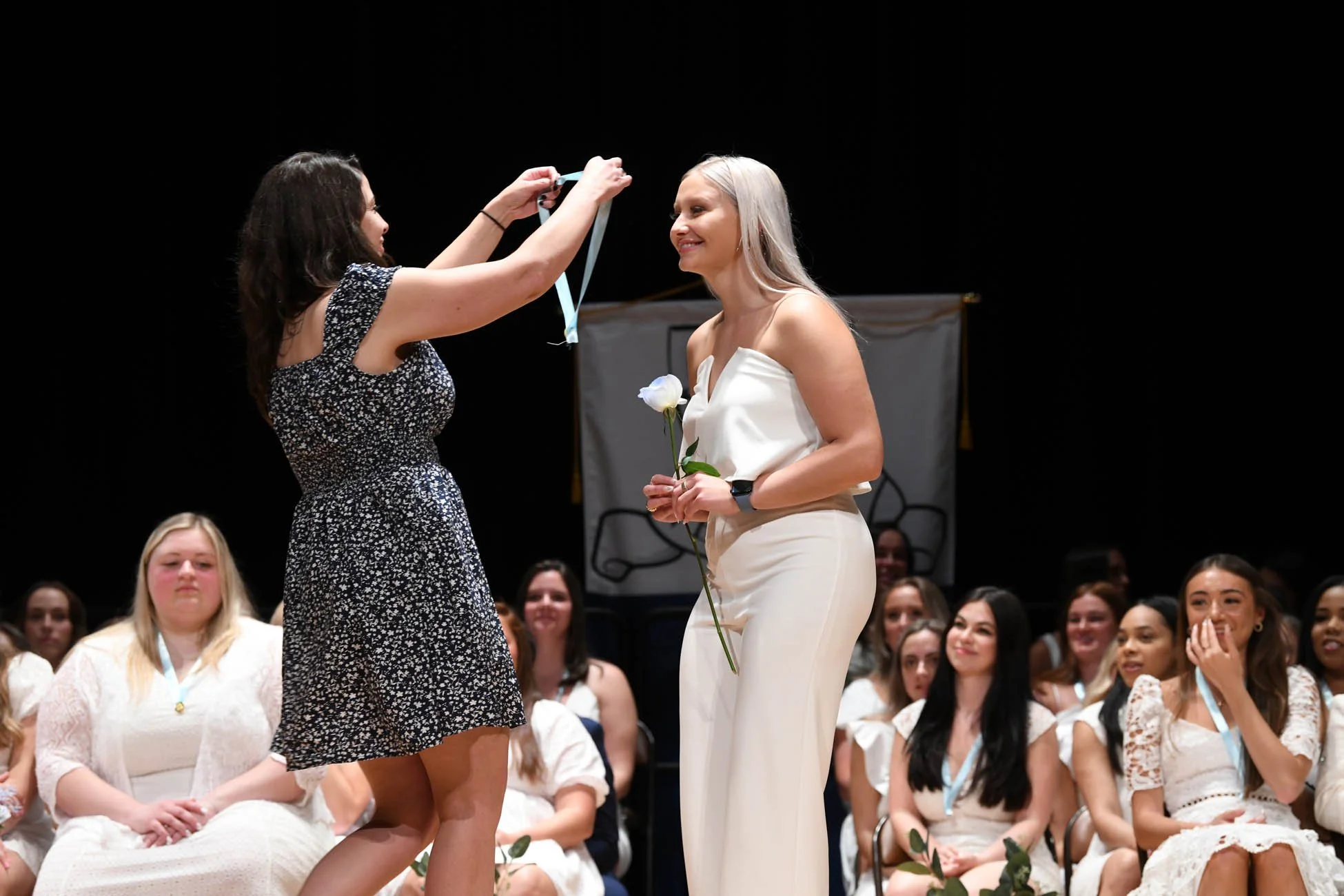 Fr. Gregoire Fluet, chaplain and director of Campus Ministry, blessed the pins, which were presented to the graduates by chosen family members and friends.